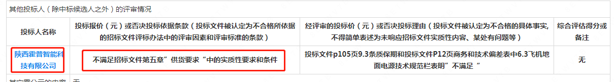 甚至连公司蓄电池供应商陕西霍普智能科技有限公司都出现在公司中标项目《成都天府国际机场国航基地工程(机务维修一期)中频电源设备采购》成交公告中,最终却因不满足招标文件第五章”供货要求“中的实质性要求和条件而未能进入评选阶段。