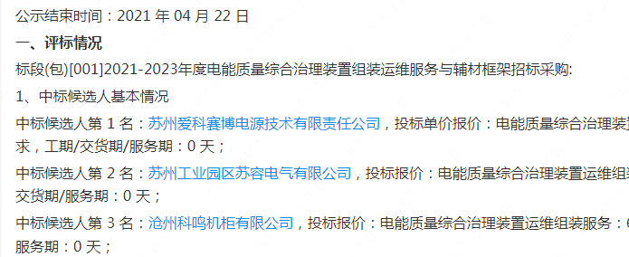 不仅如此,报告期内爱科赛博还与供应商多次同台竞标,而最终也是公司中标也是难免有围标的嫌疑。其中公司中标项目《广州电力设计院有限公司 2021-2023 年度电能质量综合治理装置箱体框架招标采购项目》中标候选人公示中就出现了公司报告期第一大供应商沧州科鸣机柜有限公司和2022年第三大供应商苏州工业园区苏容电气有限公司。