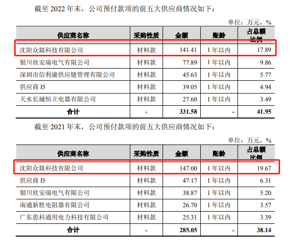 此外,《V财网》还留意到爱科赛博与其他供应商之间还另有猫腻。其中,招股书披露显示2021年末、2022年末公司预付款第一名均为沈阳众燚科技有限公司,值得注意的是作为公司预付款项的第一大供应商却并未公司同期前五大供应商。而且根据企查查显示,沈阳众燚科技有限公司成立于2021年2月24日。那么不禁令人疑惑的是一个刚成立公司何德何能可以获得当期近20%的预付款呢?