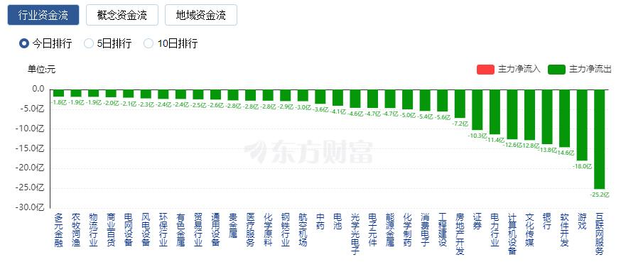 净流出方面,互联网服务、游戏、软件开发等净流出排名靠前,其中互联网服务净流出25.21亿元。