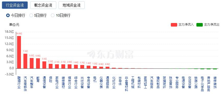 行业资金方面,截至收盘,酿酒行业、汽车零部件、汽车整车等净流入排名靠前,其中酿酒行业净流入15.99亿元。