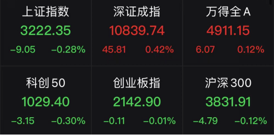 上午收盘,上证指数下跌0.28%,深证成指上涨0.42%,创业板指下跌0.01%。
