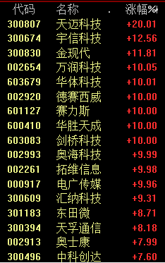 今天上午,华为产业链概念大涨,天迈科技20%涨停,金现代涨超11%,宇信科技涨超12%。