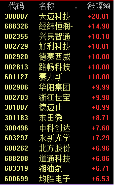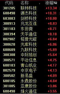 AI硬件今天上午继续大涨,光模块板块再度爆发,联特科技涨超13%,剑桥科技涨停。