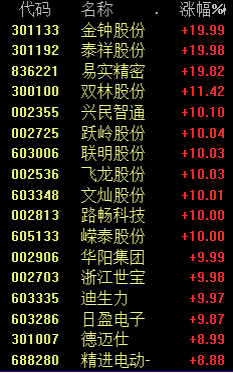 汽车零部件板块上午掀起涨停潮,金钟股份、泰祥股份等20%涨停。